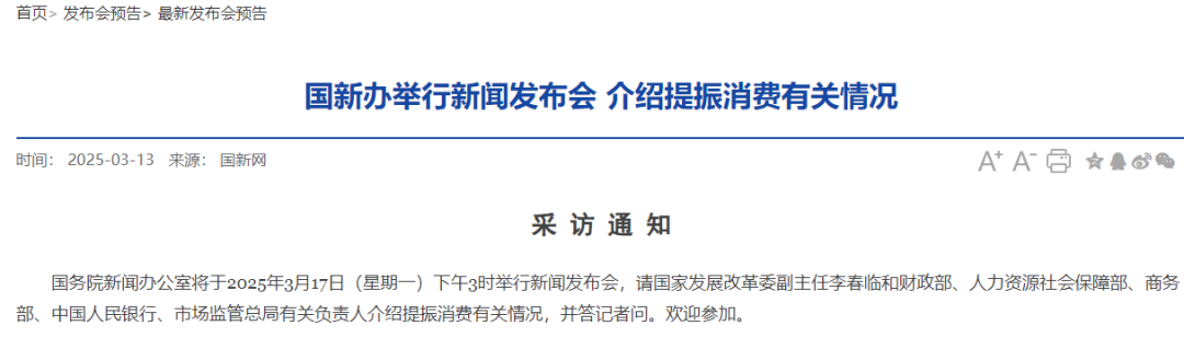 国务院新闻办公室网站3月13日消息,国务院新闻办公室将于2025年3月17日(星期一)下午3时举行新闻发布会,请国家发展改革委副主任李春临和财政部、人力资源社会保障部、商务部、中国人民银行、市场监管总局有关负责人介绍提振消费有关情况,并答记者问。
